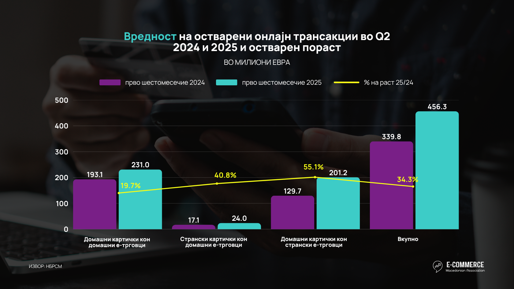 Асоцијацијата за е-трговија ги анализираше најновите објавени податоци за трансакции на места на продажба за е-трговија на Народната банка на Република Северна Македонија, согласно кои може да се забележи дека во првата половина од 2025 година вредноста на вкупните трансакции направени кон е-продажни места од Македонци дома и во странство, како и од иматели на странски картички изнесува 28,060.7 милиони денари или 456.3 милиони евра, што преставува пораст од 34.3% во однос на истиот период минатата година.