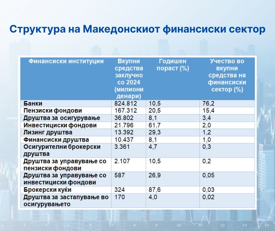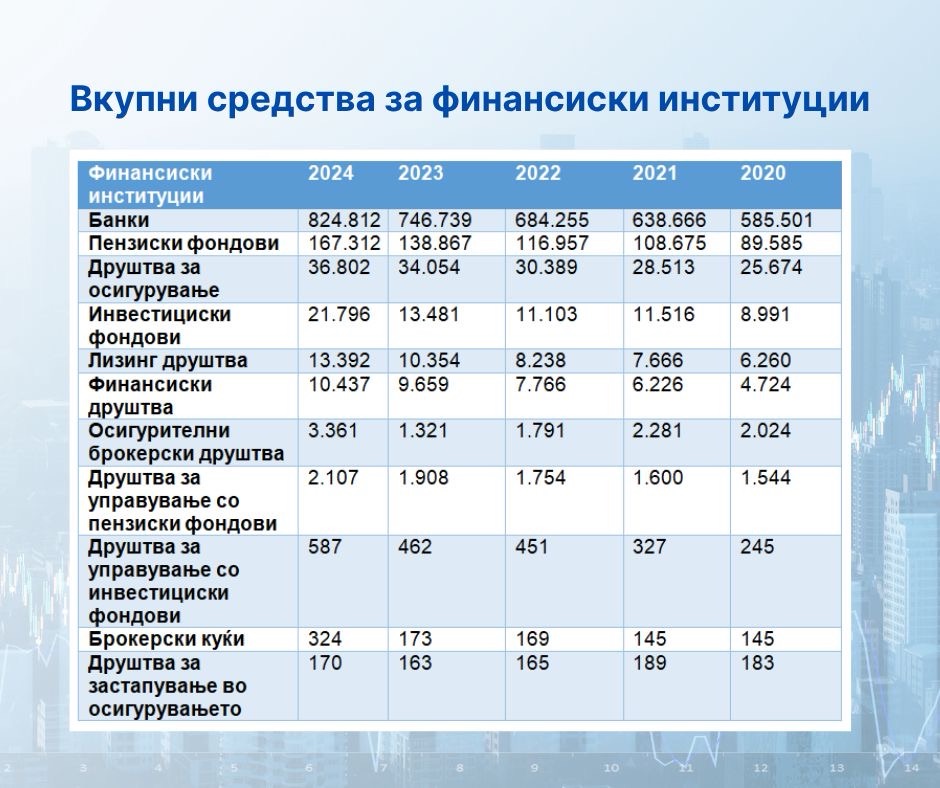 Финансискиот сектор во Македонија на крајот од 2024 година тежеше 1.083.036 милиони денари – рекордно ниво благодарение на годишниот раст на вкупните средства од 12,7%. Овој раст е побрз од оној во 2023 година (11% или 95.068 милиони денари).