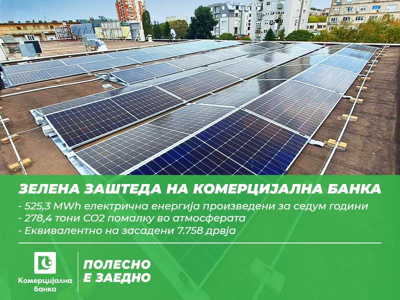 Зелената заштеда на Комерцијална банка со сопствено производство на електрична енергија преку фотоволтаични системи достигна 525,3 MWh електрична енергија и спречено испуштање на 278,4 тони CO₂.