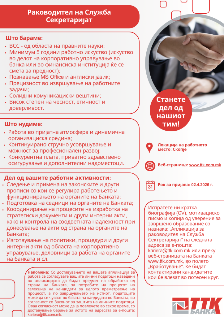 Банката има тековна потреба за вработување во Служба за Секретаријат и за таа цел, ТТК Банка АД Скопје објавува: