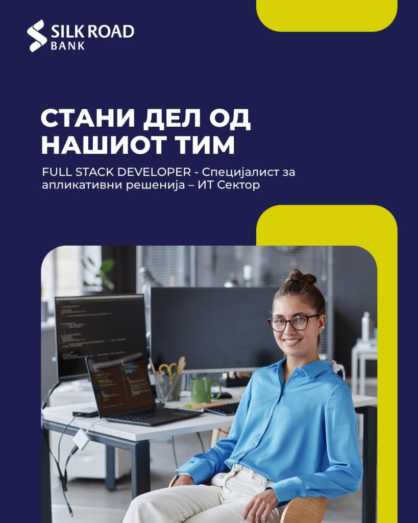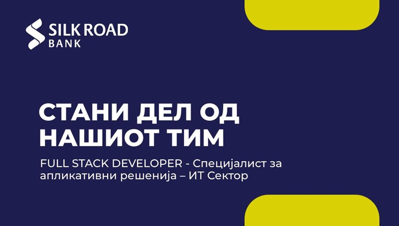 Доколку имаш желба за работа во динамична, квалитетна и пријатна работна средина, каде приоритет се личниот развој и професионалниот напредок, сега е вистинскиот момент да се пријавиш на огласот на Силк Роуд Банка за FULL STACK DEVELOPER (Специјалист за апликативни решенија – ИТ Сектор) во Сектор за ИТ.