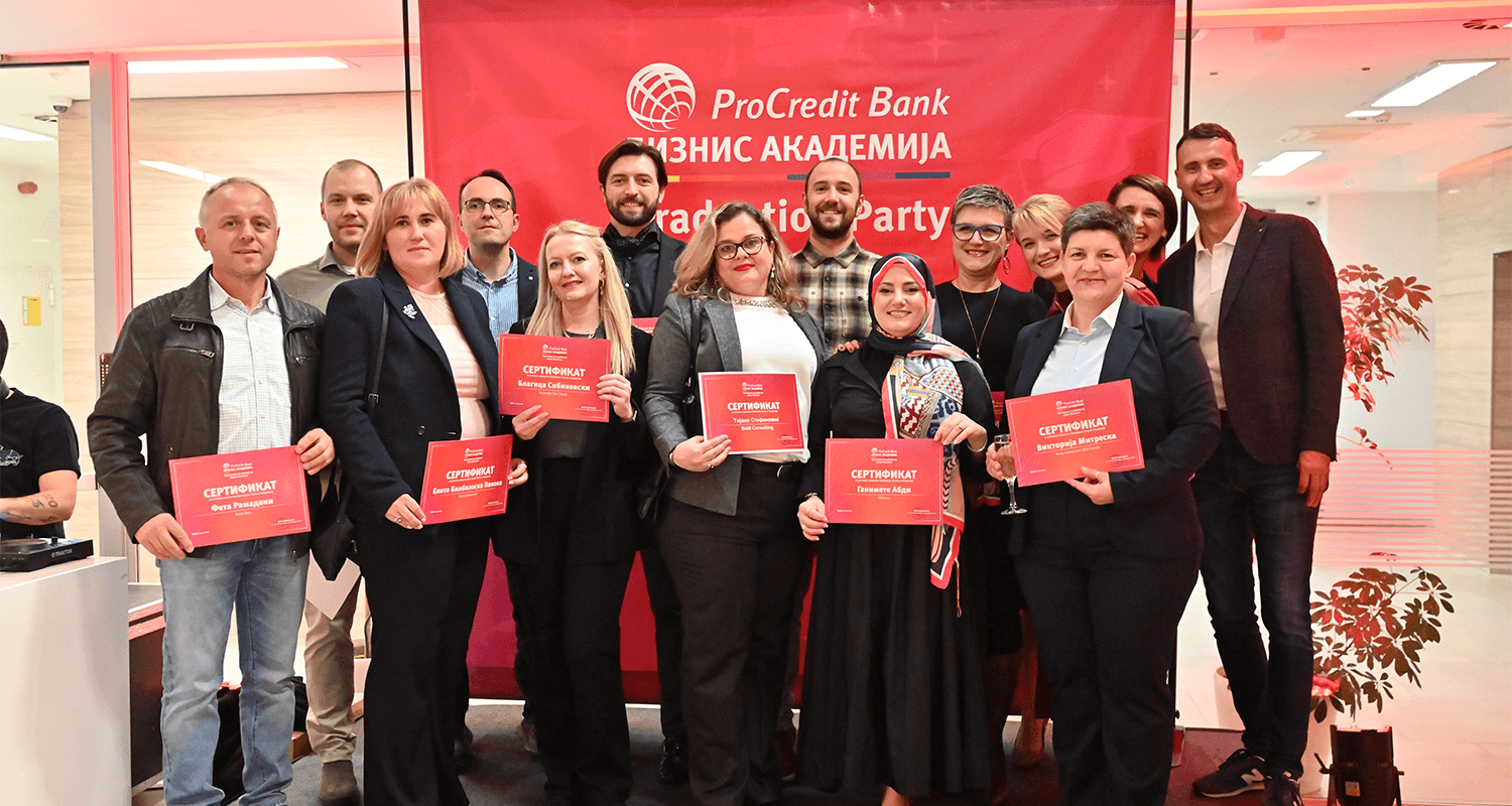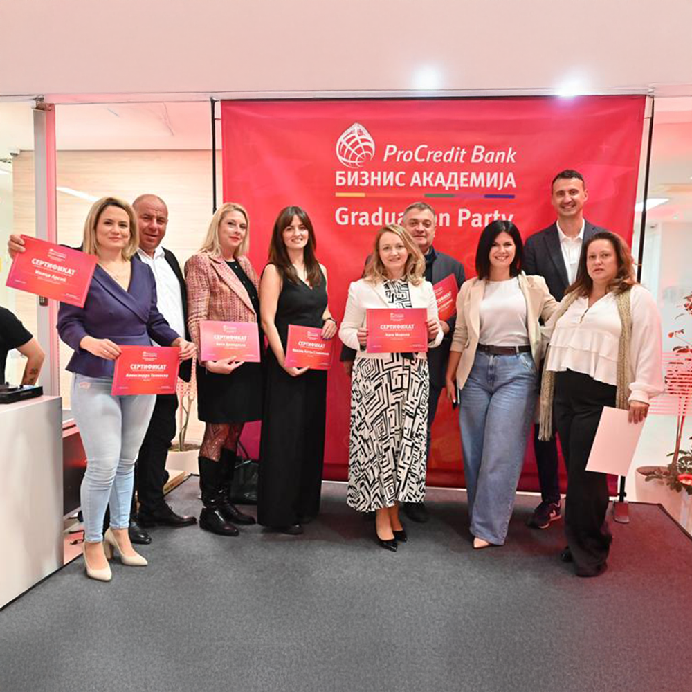 Со свечена церемонија и завршен коктел, ПроКредит Банка ја заокружи првата генерација од ПроКредит Бизнис Академијата – едукативна програма создадена за унапредување на знаењата и капацитетите на локалните компании. На настанот, 90 учесници добија сертификати за успешно завршена обука и посветеност во процесот на учење и личен развој.