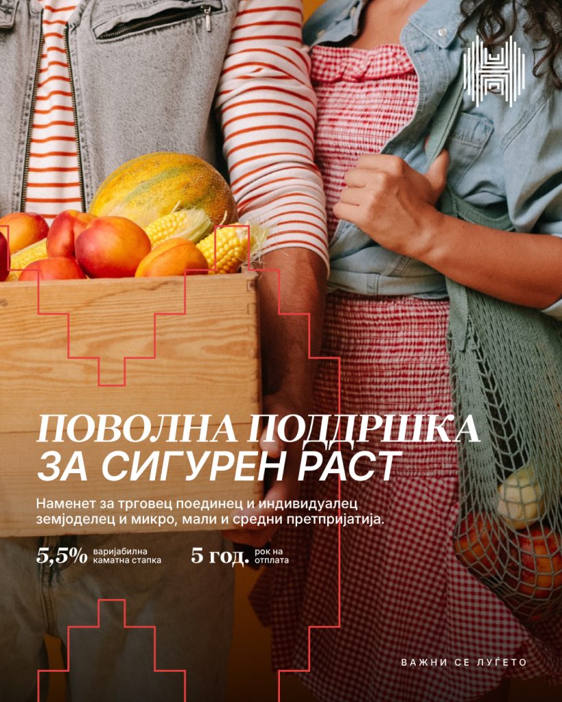 Кредитите ќе бидат одобрени под атрактивни услови, со варијабилна каматна стапка која започнува од 5,5% и со можност за флексибилна отплата преку месечни, квартални или полугодишни ануитети. Освен финансиската поддршка, програмата предвидува и дополнителни бенефити за земјоделците: организирани работилници и тренинзи преку кои ќе можат да стекнат нови знаења за современи и одржливи земјоделски практики, како и грант компонента до 1.000 евра по корисник, достапна до исцрпување на предвидениот буџет. На тој начин, кредитната линија не е само финансиски инструмент, туку и практичен поттик за модернизација и зголемување на конкурентноста на домашното земјоделство.